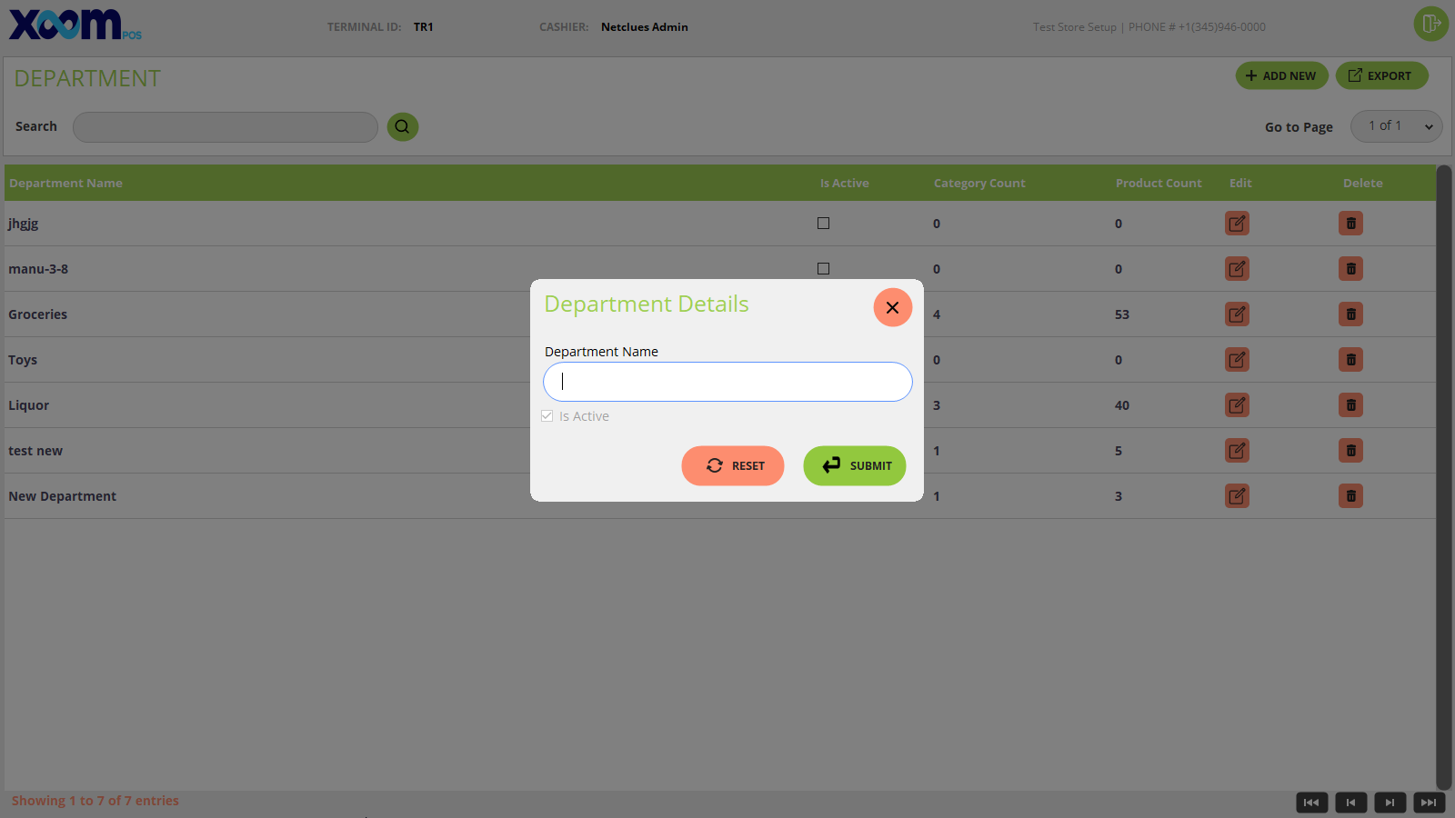 - You will be able to see the list of the departments in tabular format and column names like deportment name, is active, category count(if category is added then count shows else 0), product count(if category added to that department have product then count show else 0).