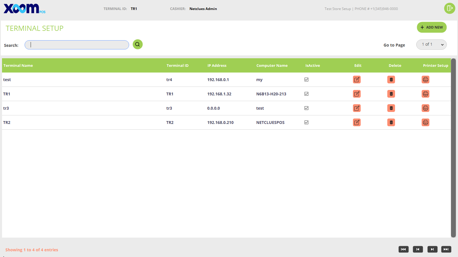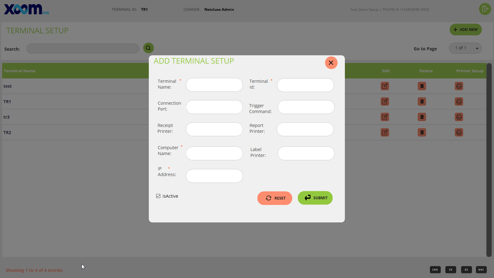 If you want to add a new terminal then by clicking on the ‘Add New’ button terminal detail popup will appear and fields like terminal name, ID, connection port, trigger command, report printer, receipt printer, computer name, label printer, and IP address shown with active inactive checkbox. Below is the screenshot for your reference: