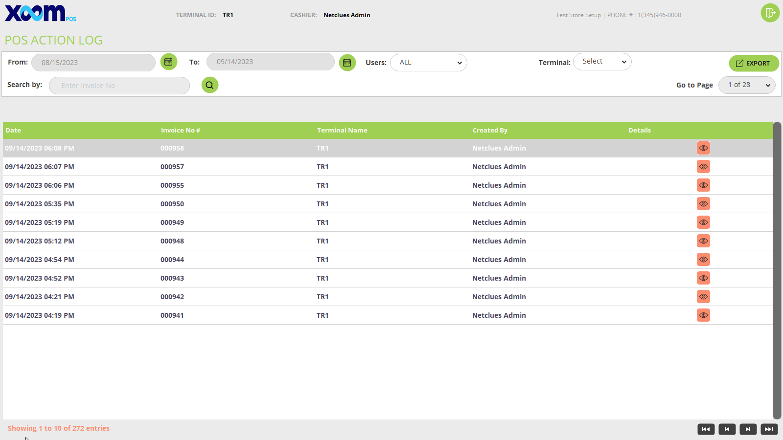 • You can filter it by From and To date, By user and terminal, and search by invoice number.