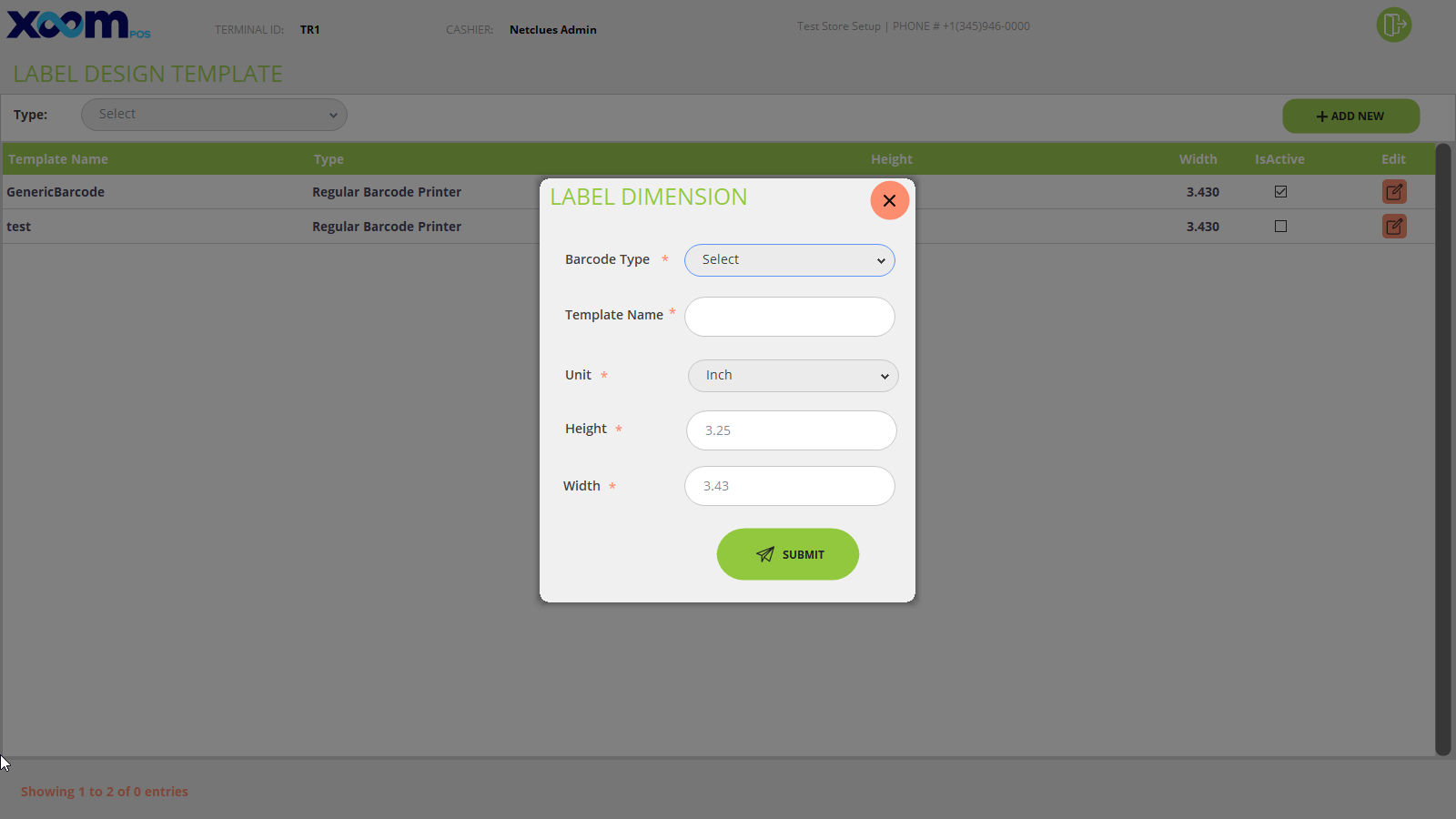 If you want to create a new label design template, then click on Add New, a pop-up will open where you need to add the label dimensions information like Barcode Type, Template Name, Unit, Height, and Width, and click on ‘Submit’. Please refer to the below screenshot: