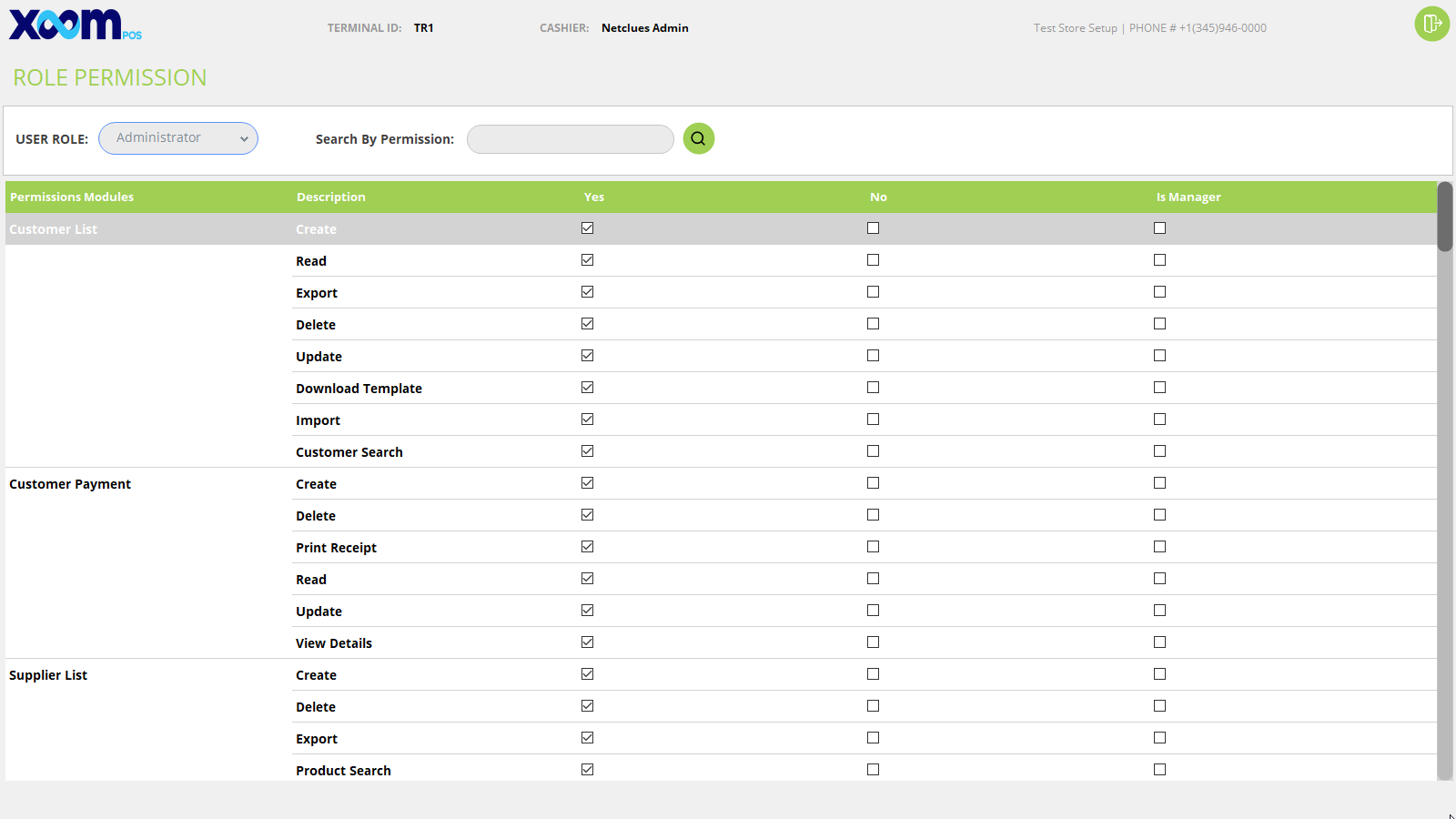 On gird it shows permission name, action name, given permission then yes else no, also IsManager.